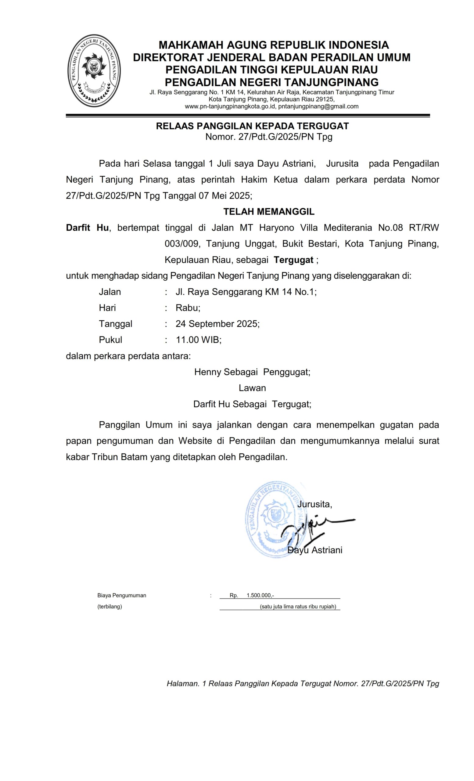 RELAAS PANGGILAN KEPADA TERGUGAT Nomor. 27/Pdt.G/2025/PN Tpg Pengumuman Juli 3, 2025Juli 4, 2025adminptsp