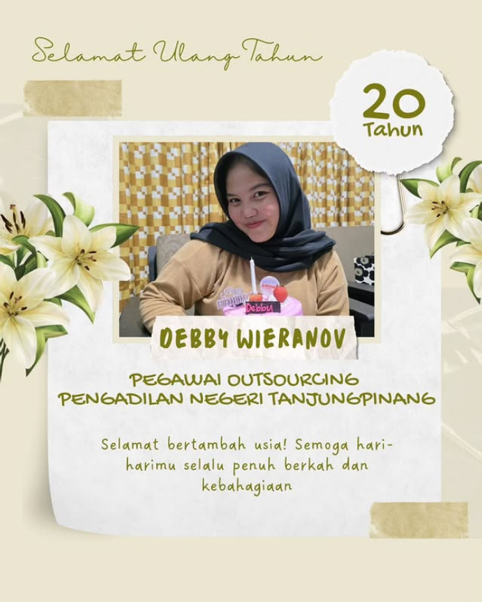 Selamat Ulang Tahun yang Ke 20 Tahun Kepada Debby Wieranov, Pegawai Outsourcing Pengadilan Negeri Tanjungpinang.