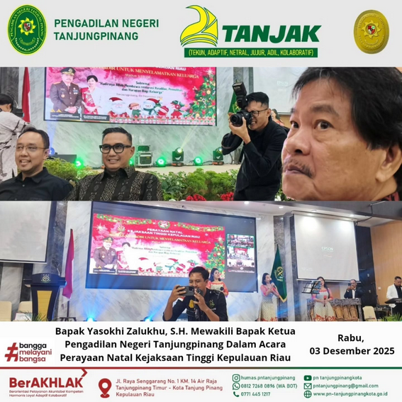 Jika anda memiliki pertanyaan seputar pelayanan, silahkan datang ke meja Pelayanan Terpadu Satu Pintu (PTSP) bagian informasi atau melalui chat WhatsApp di nomor 081272680896 pada jam layanan (09.00 – 15.00 WIB)Bapak Yasokhi Zalukhu, S.H. Mewakili Bapak Ketua Pengadilan Negeri Tanjungpinang Dalam Acara Perayaan Natal Kejaksaan Tinggi Kepulauan Riau. Rabu, 03 Desember 2025.