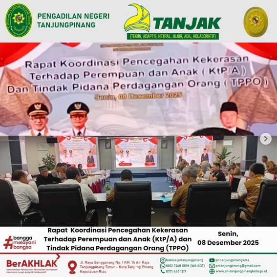 Bapak Wedy Novizar, S.H. Mewakili Bapak Ketua Pengadilan Negeri Tanjungpinang dalam Menghadiri Rapat Koordinasi Pencegahan Kekerasan Terhadap Perempuan dan Anak (KtP/A) dan Tindak Pidana Perdagangan Orang (TPPO). Senin, 08 Desember 2025.
