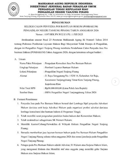 Seleksi Calon Penyedia Pos Bantuan Hukum (POSBAKUM) Pengadilan Negeri Tanjungpinang Tahun Anggaran 2026.