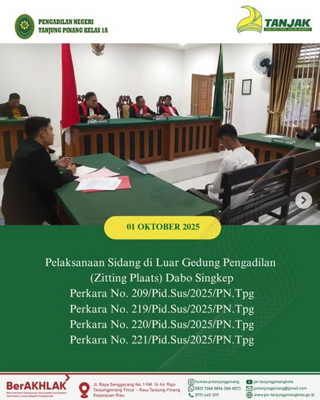 Selengkapnya..Pelaksanaan Sidang di Luar Gedung Pengadilan (Zitting Plaats) Dabo Singkep. Perkara No. 209/Pid.Sus/2025/PN.Tpg Perkara No. 219/Pid.Sus/2025/PN.Tpg Perkara No. 220/Pid.Sus/2025/PN.Tpg Perkara No. 221/Pid.Sus/2025/PN.Tpg Rabu, 01 Oktober 2025. @ptkepulauanriau @ditjenbadilum @humas.pntanjungpinang #MahkamahAgungRI #DitjenBadilum #PTKepri