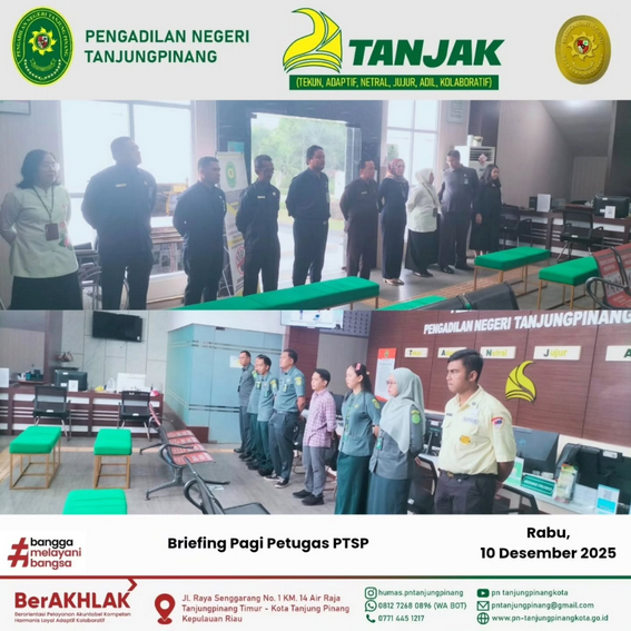 Briefing Pagi Petugas PTSP. Kamis, 11 Desember 2025. Hal Yang Perlu Diingat Untuk Petugas PTSP yaitu: 1. Untuk selalu menjalankan 5 S (Senyum, Salam, Sapa, Sopan, Santun) 2. Untuk selalu menjalankan 5 R (Ringkas, Rapi, Resik, Rawat, Rajin) — Bantu kami memperbaiki kualitas pelayanan dengan mengisi survey pelayanan melalui link berikut ini https://esurvey.badilum.mahkamahagung.go.id/badilum/index.php/kontrol_dashboard Jika anda […]